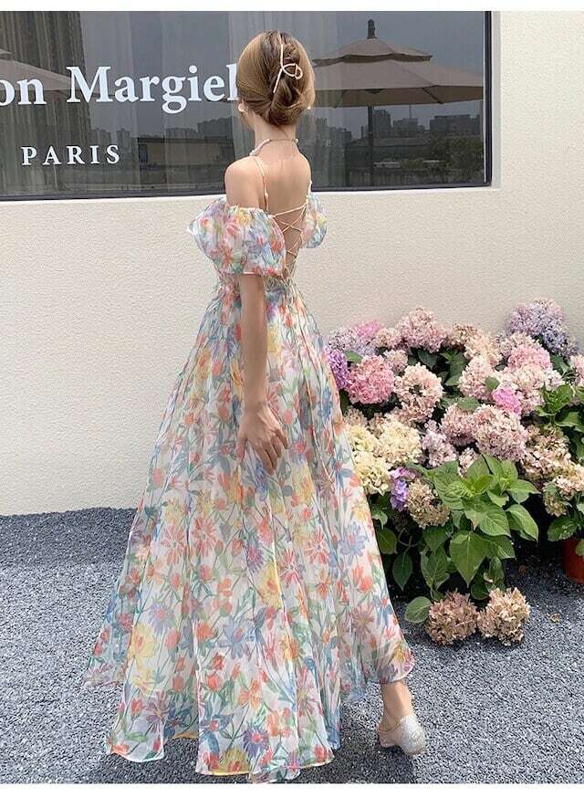 花柄ワンピース シフォンワンピース バックリボンワンピース フェミニン リゾート お呼ばれ E227